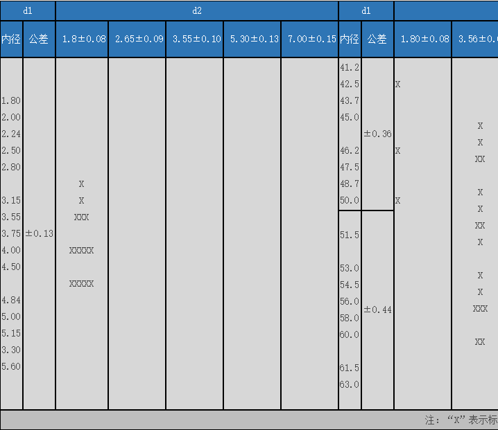 *通常標準O形橡膠密封圈的內徑、截面及公差規格表:(單位mm)